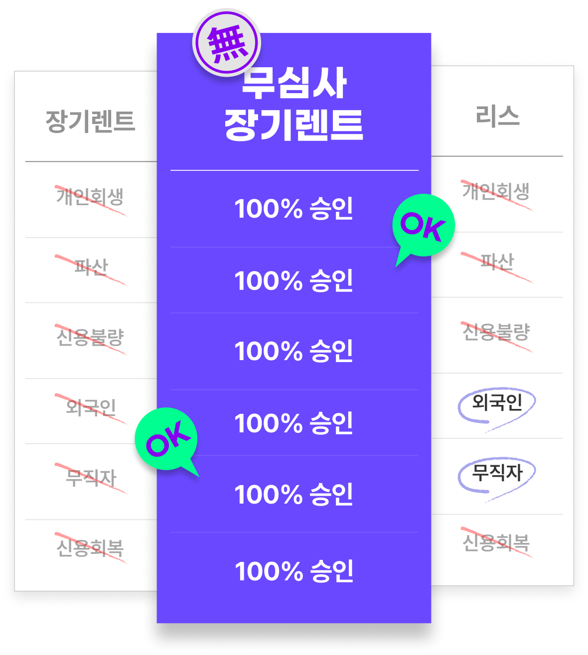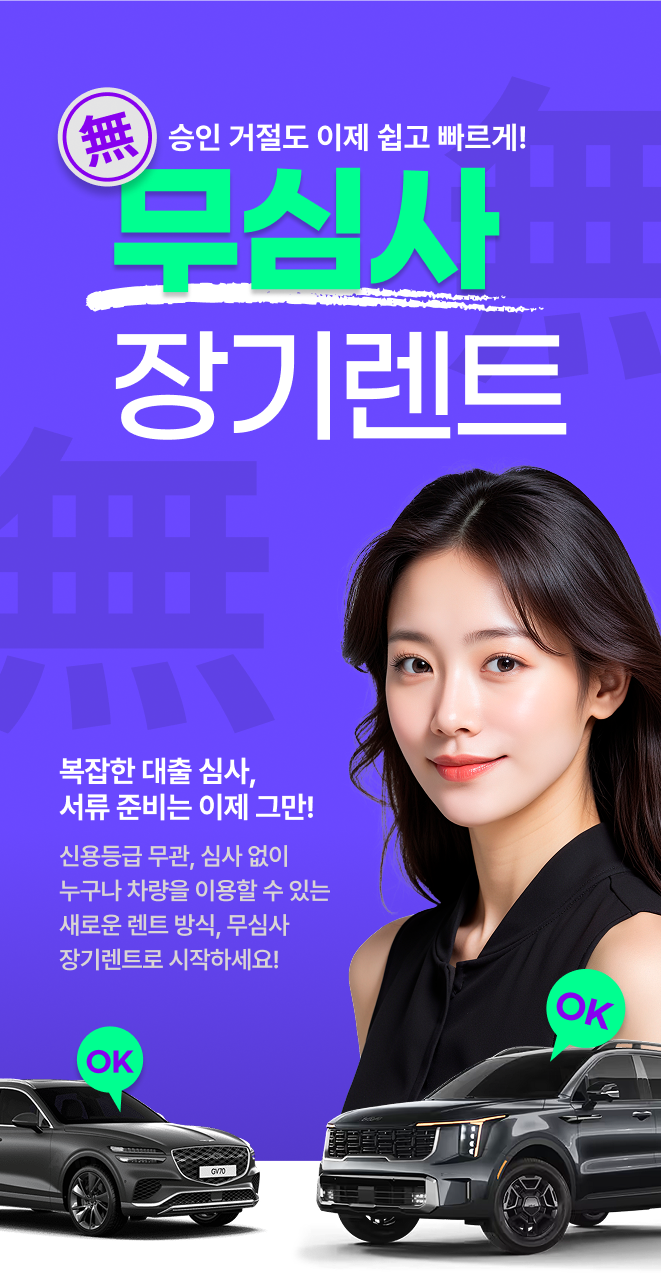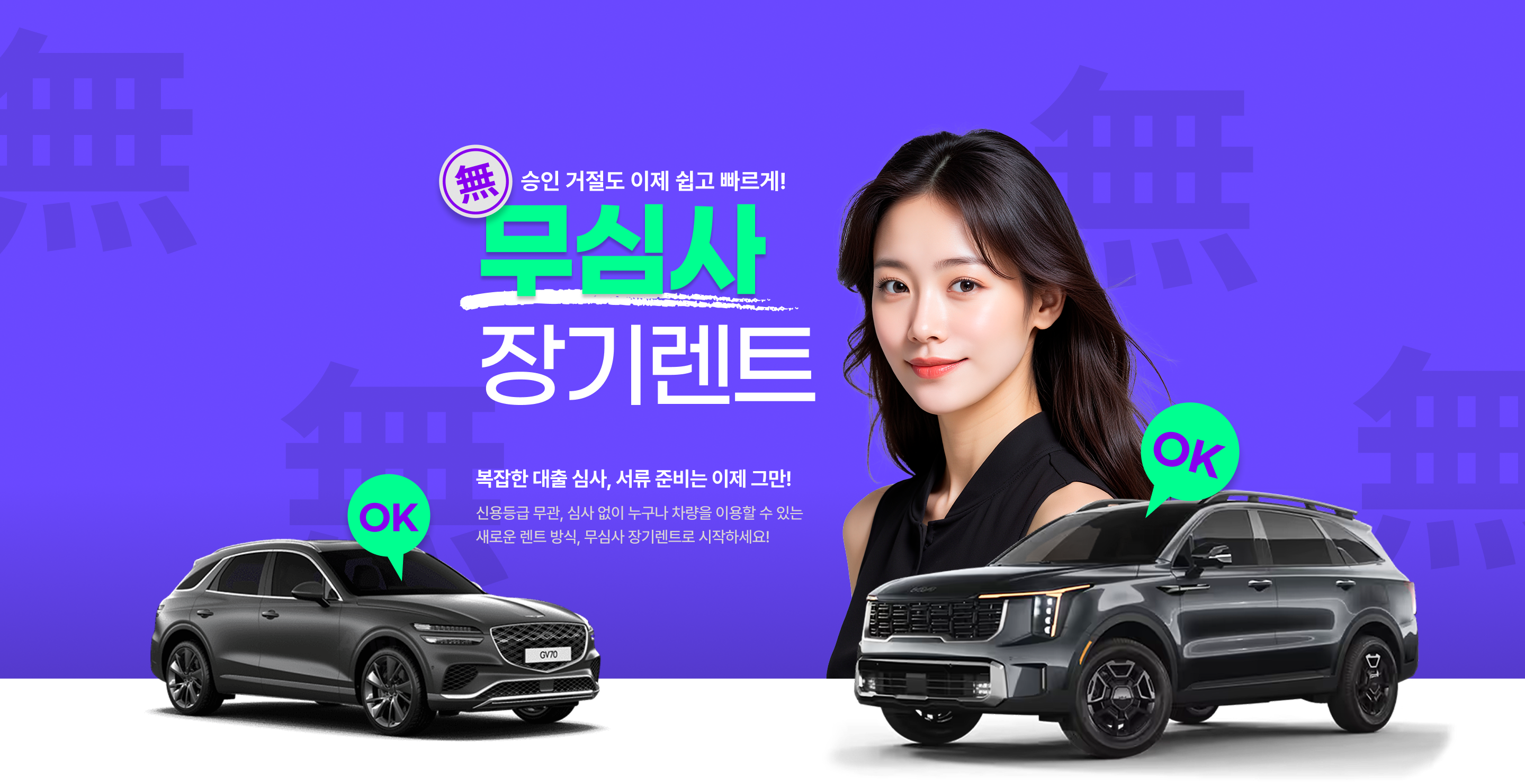 무심사·무보증·저신용 고객 전용 장기렌트 솔루션으로 누구나 간편하게, 빠르게 차량을 출고할 수 있습니다. 부담은 낮추고, 만족은 높인 새로운 장기렌트를 경험하세요.